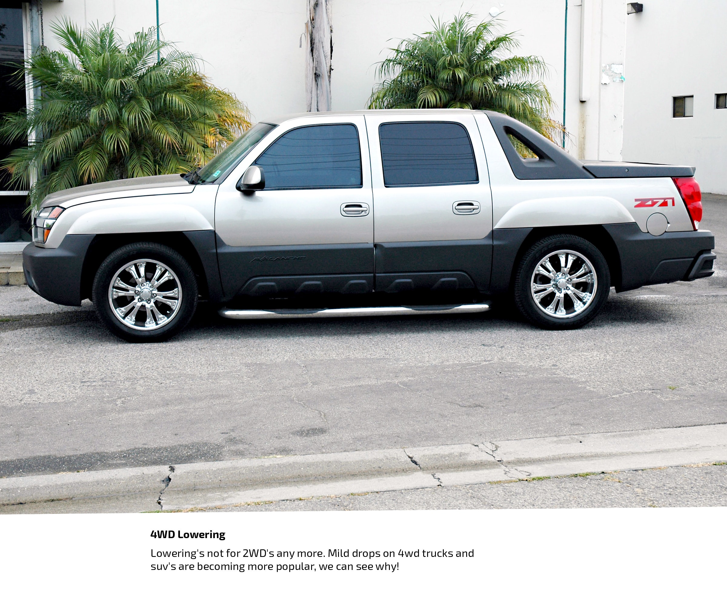There’s a new sheriff in town, a new fad is born, it’s the latest thing, give up? Dropping 4WD’s used to be an adventure in the world of custom suspension sometimes it worked, sometimes, well you know. Times have changed, four wheel trucks don’t just pull stumps and yank cows from the mud, they are the family ride, the toy hauler, the project truck. Just as trucks have become a preferred cruising choice, 4WD trucks have taken their rightful place in the business of urban people hauling. The modern 4WD can be lowered just like their 2WD cousins, infact those 22’s that you’ve had your eye on would look pretty hot on that 4WD Avalanche, if only you could lower it, and were going to show you just how to do it.