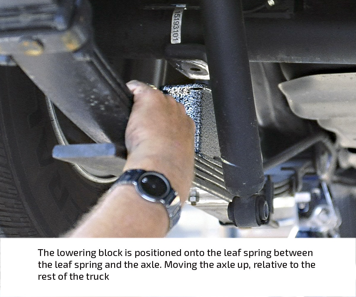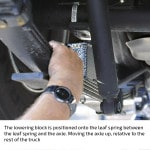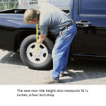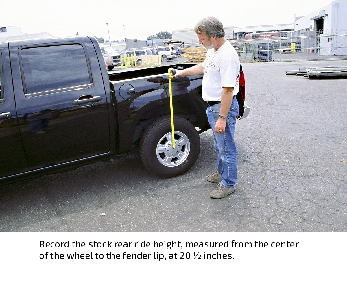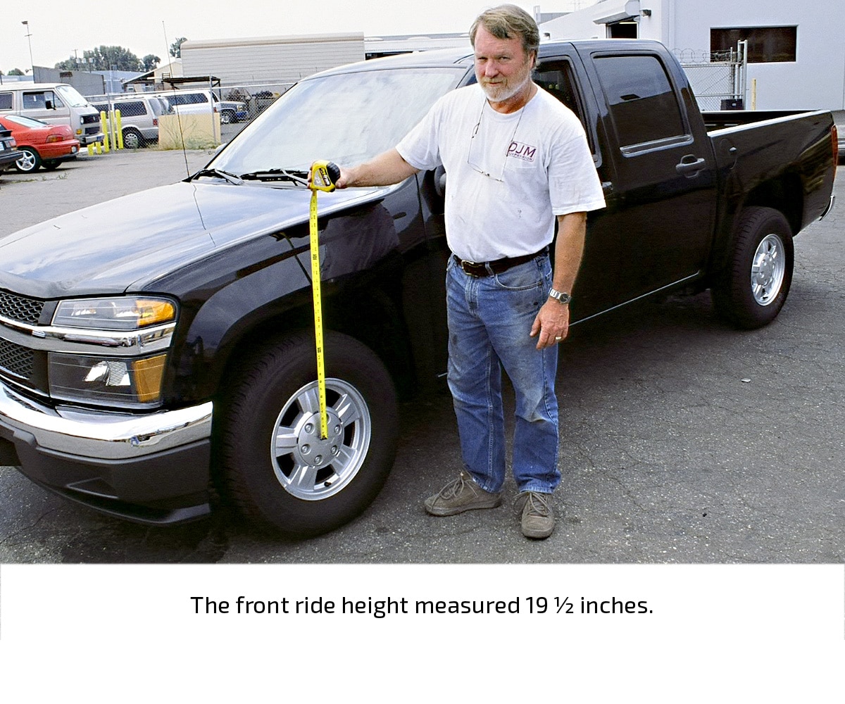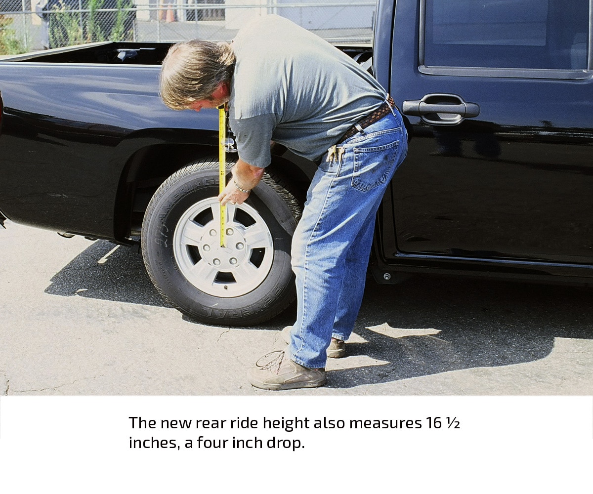 The stock ride height of the black, four-door Colorado in this installation demonstration measured 19 ½ inches in front and 20 ½ inches in the rear (measured from the center of the wheel to the fender lip). After the installation, the ride height measured exactly 16 ½ inches at both ends, indicating a three-inch drop in front and a four-inch drop in the rear.