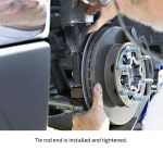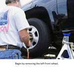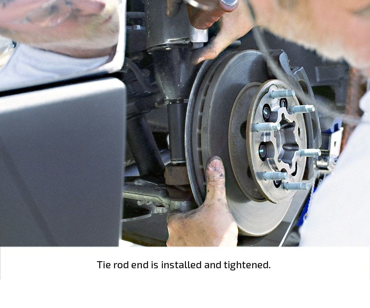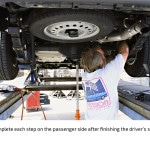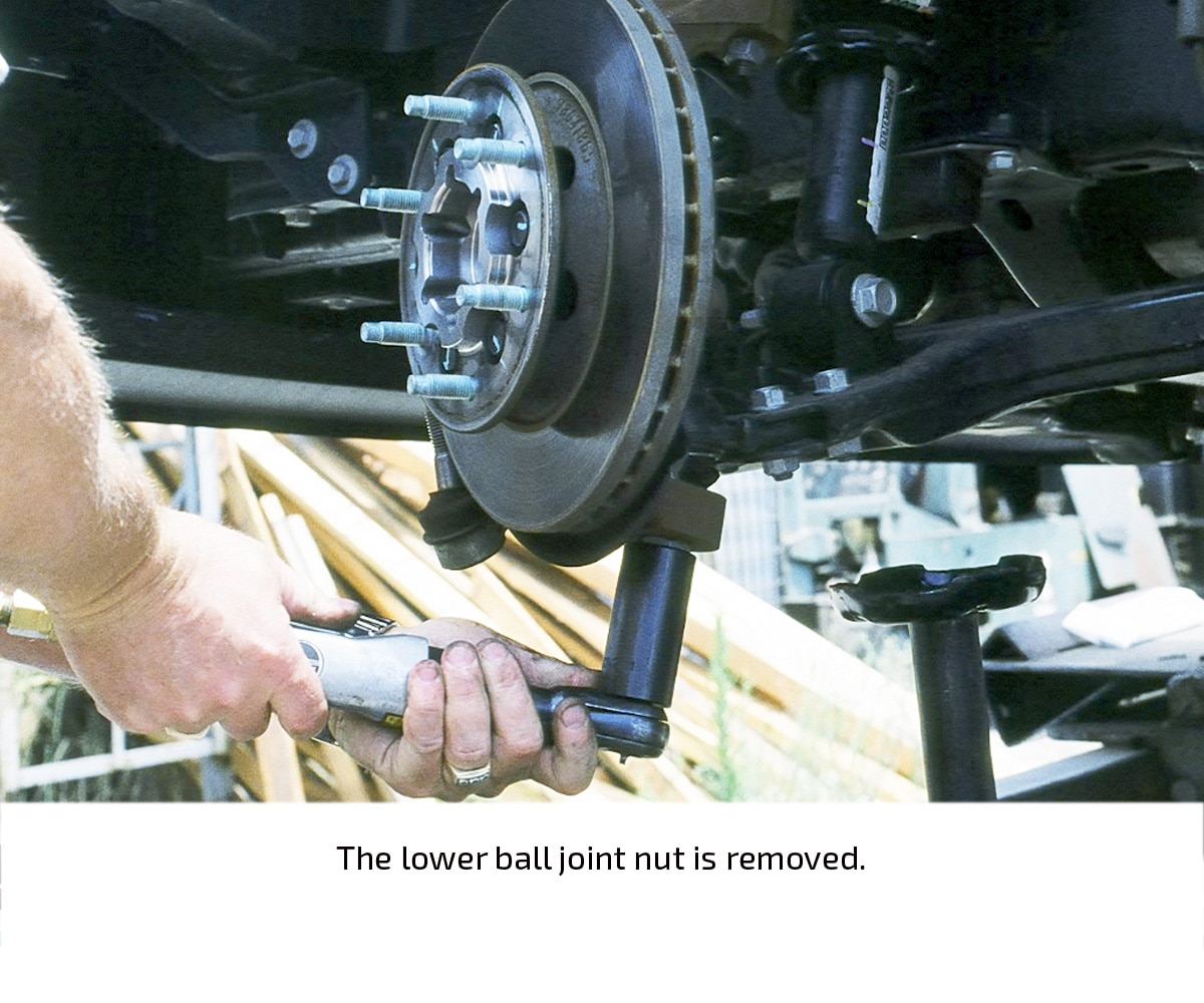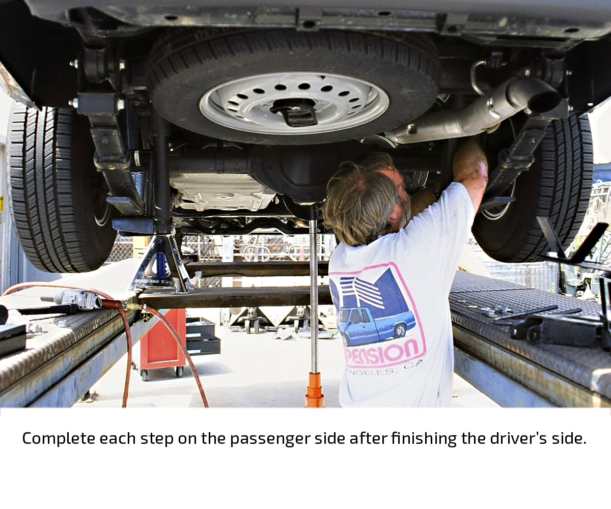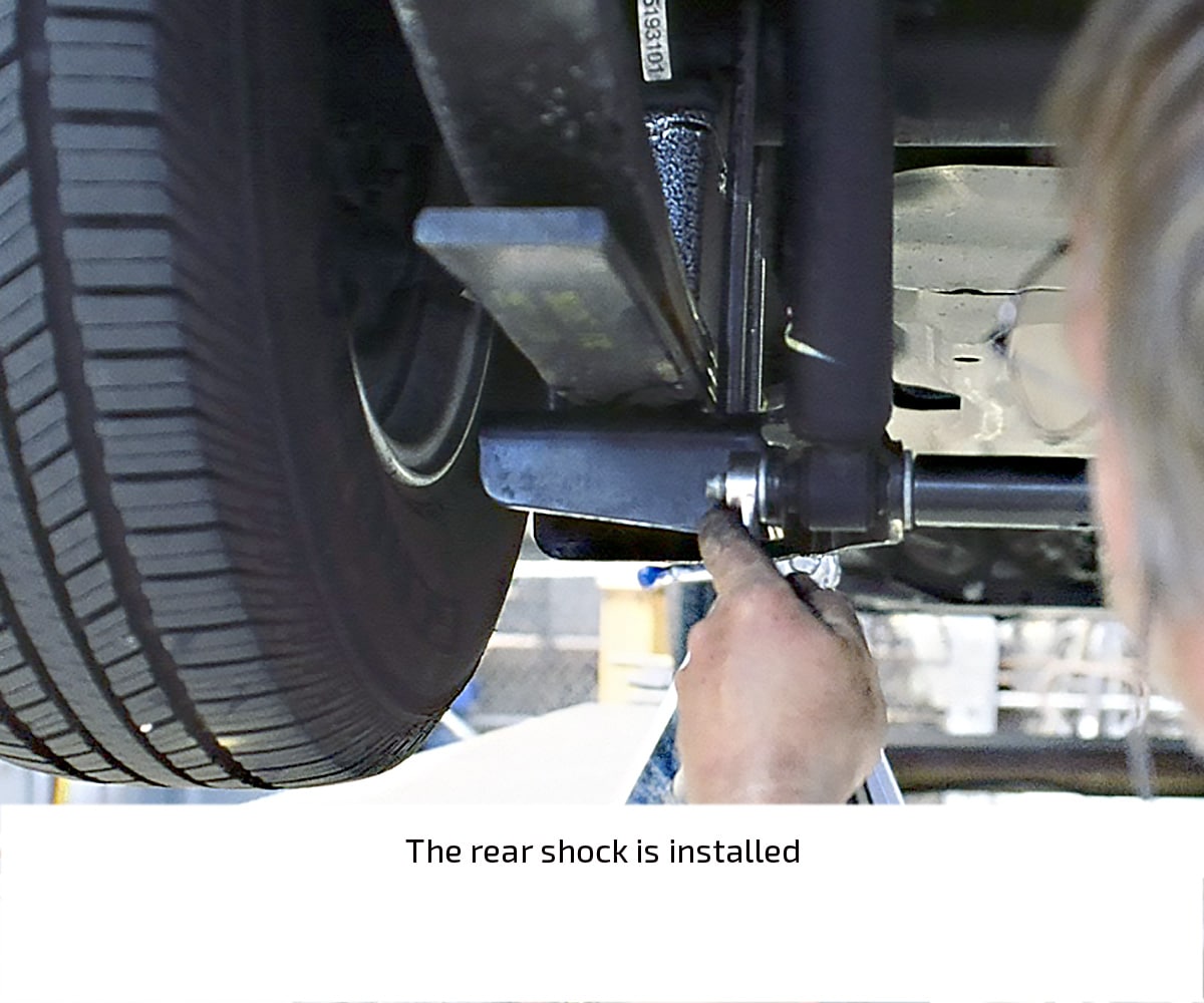 The stock ride height of the black, four-door Colorado in this installation demonstration measured 19 ½ inches in front and 20 ½ inches in the rear (measured from the center of the wheel to the fender lip). After the installation, the ride height measured exactly 16 ½ inches at both ends, indicating a three-inch drop in front and a four-inch drop in the rear.