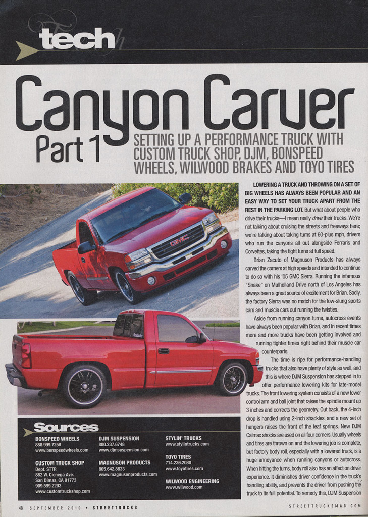 "Lowering a truck and throwing on a set of big wheels has always been popular and an easy way to set your truck apart from the rest in the parking lot. But what aboutpepole who drive their trucks. We're not talking aboutcrusing the streets and freeways here; we're talking bout taking turns at 60-plus mph, drivers who run the canyons all out along side Ferraris and Corvettes, taking turns at full speed".